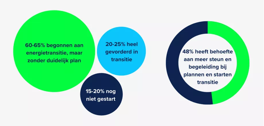 De meerderheid van de publieke instanties in Vlaanderen zijn al bezig met de energietransitie. 20 à 25% van onze steekproef is zelfs al relatief ver gevorderd in hun traject – vaak met een gedetailleerde en volledige planning, en duidelijk zicht op het kostenplaatje. Een veel grotere groep (60 à 65%) is de energietransitie ook al begonnen, maar beschikt nog niet over een totaalplan of gedetailleerd kosteninzicht. 15 à 20% van de steekproef is zelfs nog niet begonnen. In deze cases ontbreekt ook het bewustzijn van de transitiebepalingen en implicaties voor hun organisatie.